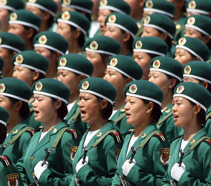 國慶60周年閱兵方陣中有三支“娘子軍”:三軍女兵方隊、女民兵方隊、女飛行員梯隊。這是新中國歷次閱兵中女兵方隊最多的一次,其中三軍女兵方隊和女飛行員梯隊是首次參加。圖片來源:新華網(wǎng)