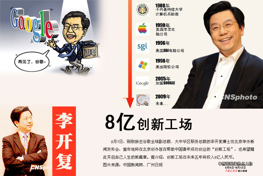 中新網(wǎng)本周熱點人物之——李開復(fù) 剛剛辭去谷歌全球副總裁、大中華區(qū)職務(wù)總裁的李開復(fù)博士在北京舉辦新聞發(fā)布會,宣布他將在北京創(chuàng)辦旨在幫助中國青年成功創(chuàng)業(yè)的“創(chuàng)新工場”,也希望藉此開啟自己人生的新篇章。據(jù)介紹,創(chuàng)新工場在未來五年將投入8億人民幣。