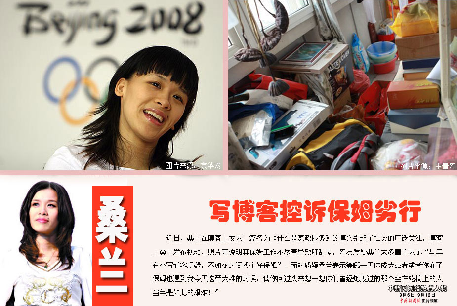 中新網(wǎng)本周熱點(diǎn)人物之——桑蘭 近日,桑蘭在博客上發(fā)表一篇名為《什么是家政服務(wù)》的博文引起了社會(huì)的廣泛關(guān)注。博客上桑蘭發(fā)布視頻、照片等說(shuō)明其保姆工作不盡責(zé)導(dǎo)致臟亂差。有網(wǎng)友質(zhì)疑桑蘭太多事并表示“與其有空寫(xiě)博客質(zhì)疑,不如花時(shí)間找個(gè)好保姆”。面對(duì)質(zhì)疑桑蘭稱(chēng)“別以為‘輪椅事件’ ‘神醫(yī)門(mén)’‘保姆門(mén)’就認(rèn)為我是個(gè)怨婦或者那么唧唧歪歪。等哪一天你坐上輪椅乘飛機(jī),你成為患者或者你雇了保姆也遇到我今天這番為難的時(shí)候,請(qǐng)你回過(guò)頭來(lái)想一想你們?cè)?jīng)炮轟過(guò)的那個(gè)坐在輪椅上的人當(dāng)年是如此的艱難!”