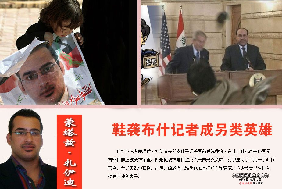 中新網(wǎng)本周熱點(diǎn)人物之——蒙塔茲·扎伊迪 伊拉克記者蒙塔茲·扎伊迪先前拿鞋子丟美國(guó)前總統(tǒng)喬治·布什,觸犯襲擊外國(guó)元首罪目前正被關(guān)在牢里。但是他現(xiàn)在是伊拉克人民的另類(lèi)英雄,扎伊迪將于下周一(14日)獲釋。為了慶祝他獲釋?zhuān)恋系睦习逡呀?jīng)為他準(zhǔn)備好新車(chē)和豪宅,不少美女已經(jīng)排隊(duì)想要當(dāng)他的妻子。