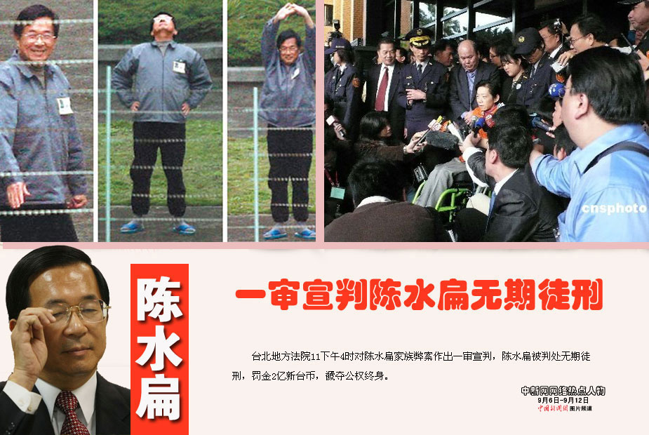 中新網(wǎng)本周熱點(diǎn)人物之——陳水扁 臺(tái)北地方法院11下午4時(shí)對(duì)陳水扁家族弊案作出一審宣判,陳水扁被判處無期徒刑,罰金2億新臺(tái)幣,褫奪公權(quán)終身。