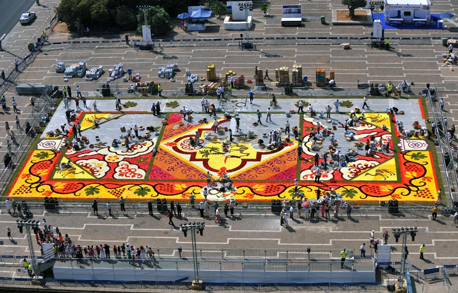據(jù)悉,原本計劃全部使用以色列的鮮花,但由于當?shù)氐孽r花產量不足,只能從布魯塞爾進口,這批鮮花每朵花的直徑都在20厘米左右。百名志愿者們費時7小時精心鋪成了這張花毯,這張鮮花地毯將展示三天,隨后將被生態(tài)埋葬。