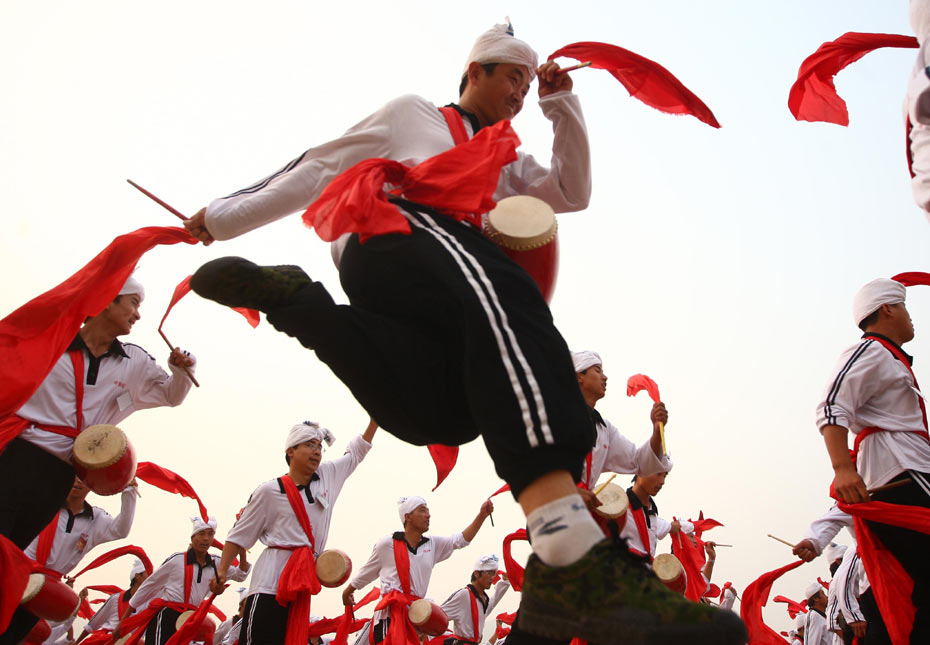 9月16日,千余名來自陜西安塞的腰鼓隊員在北京密云訓(xùn)練基地首次和其他方陣合練。該方陣隊員全部是來自陜西省延安市安塞縣的農(nóng)民,10月1日他們將走在群眾游行隊伍中,在天安門城樓前舞起安塞腰鼓。該方陣也是群眾游行隊伍中唯一一支京外隊伍,唯一一個全部由農(nóng)民組成的方陣。杜洋 攝 圖片來源:中國新聞網(wǎng)