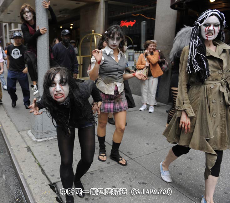 當(dāng)?shù)貢r間9月16日,在美國紐約時代廣場,一群演員裝扮成僵尸的樣子,在街頭行走,提前為下個月到來的萬圣節(jié)造勢。圖片來源:中國新聞網(wǎng)