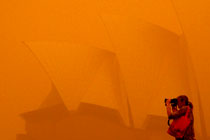 澳大利亞悉尼23日出現(xiàn)罕見的沙塵暴,加上風速每小時上百公里的強風吹襲,全城籠罩在一片橘紅色的塵霧中,由于能見度相當?shù)停w機和渡輪暫時停飛或停駛。