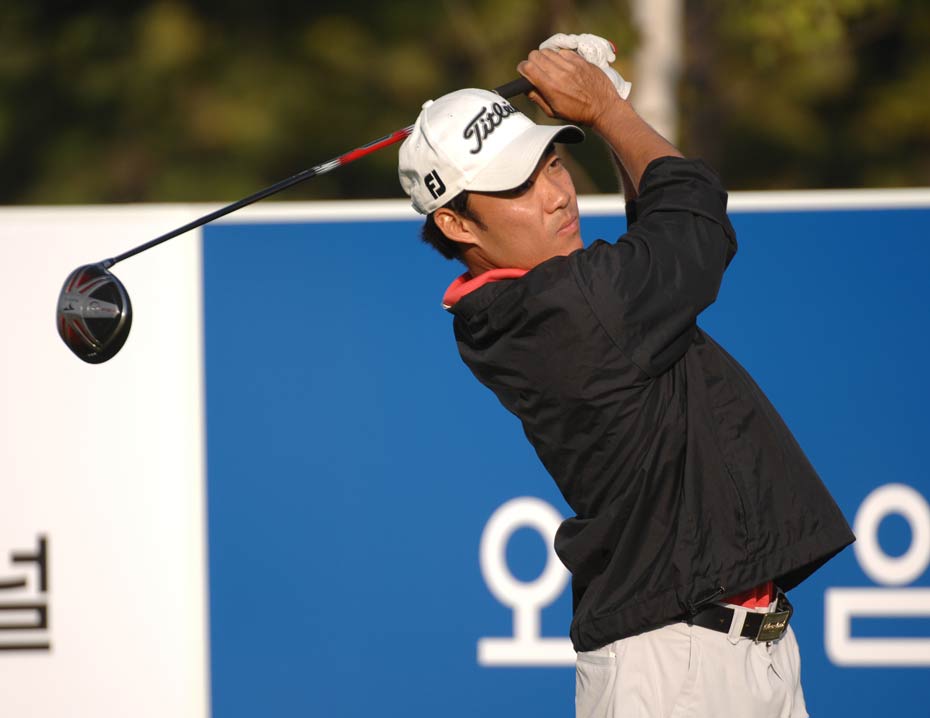 2009“韓國(guó)KEB銀行”中韓職業(yè)高爾夫球巡回賽韓國(guó)站于今天在韓國(guó)OSTAR高爾夫球俱樂部正式開桿,有47名球員代表中國(guó)參賽。圖為選手們上場(chǎng)第一天,揮桿開打的場(chǎng)面。