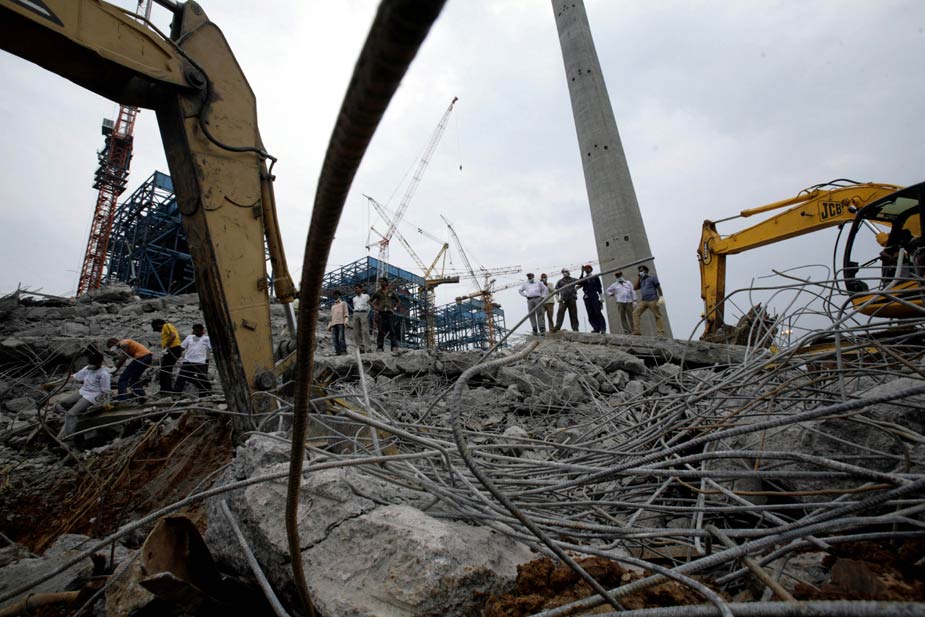 印度中部一座在建電廠的巨型煙囪23日下午發(fā)生倒塌,目前估計(jì)已有至少100人罹難。圖片來(lái)源:中國(guó)新聞網(wǎng)