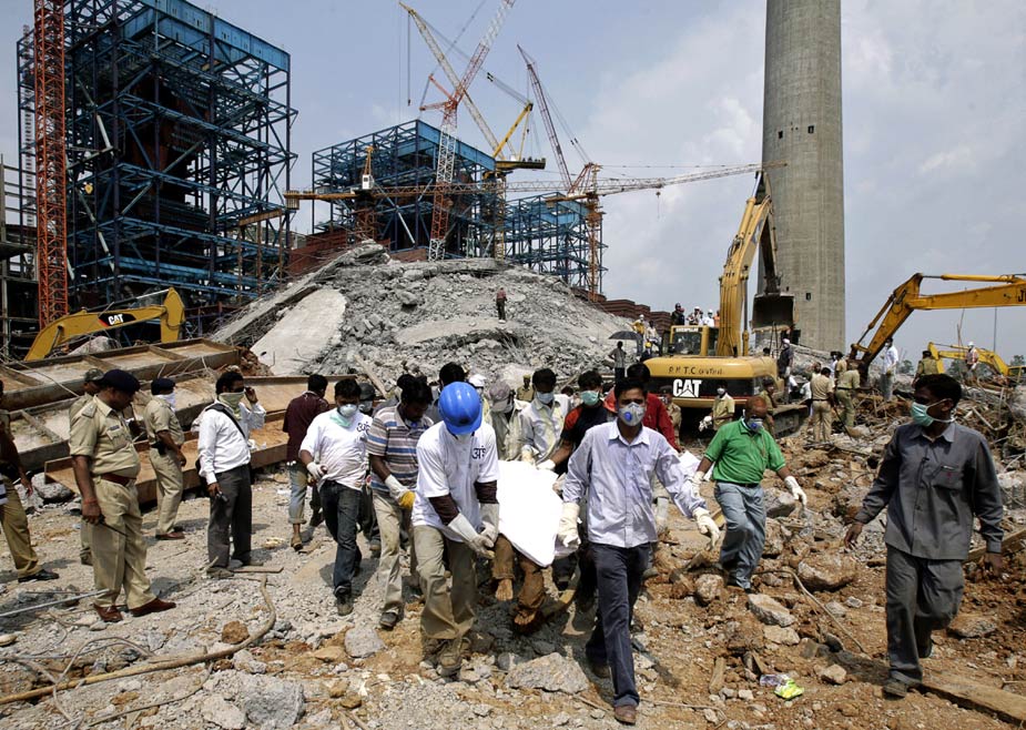 印度中部一座在建電廠的巨型煙囪23日下午發(fā)生倒塌,目前估計(jì)已有至少100人罹難。圖片來源:中國新聞網(wǎng)
