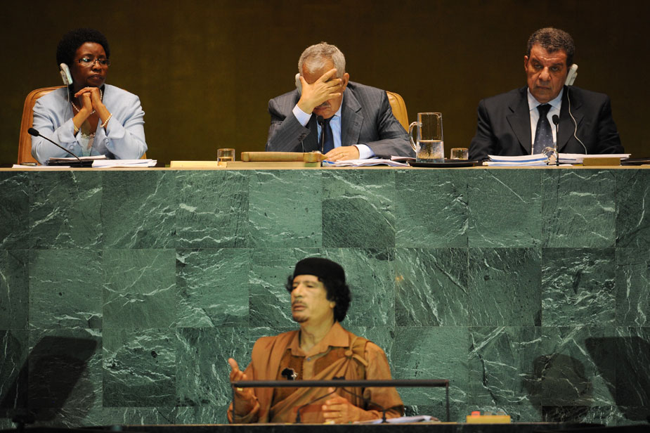 執(zhí)政40年來首次在聯(lián)合國亮相的利比亞領(lǐng)導(dǎo)人卡扎菲,23日在聯(lián)大一般性辯論上發(fā)表演講,強力攻擊安理會和聯(lián)合國的現(xiàn)有體制,并將原定15分鐘的演講拖到一個半小時,很多國家代表團(tuán)成員最后堅持不住,紛紛離開會議現(xiàn)場。圖片來源:中國新聞網(wǎng)