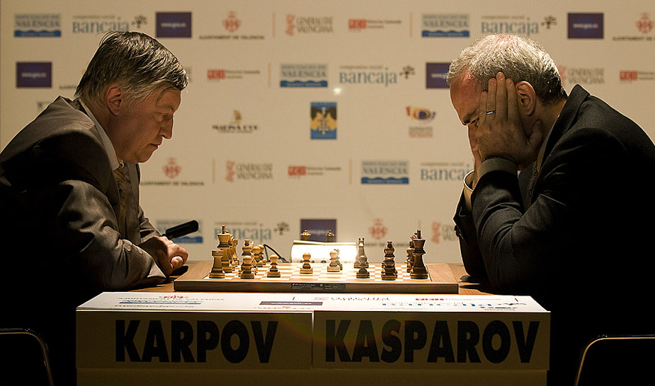 在本周,國際象棋界的兩位大師卡爾波夫(左)與卡斯帕羅夫在西班牙的巴倫西亞市開始了一場中斷25年的比賽。25年前,他們在爭奪世界冠軍的比賽中激戰(zhàn)5個月未分勝負。目前卡斯帕羅夫以2比0領(lǐng)先。圖片來源:中國新聞網(wǎng)