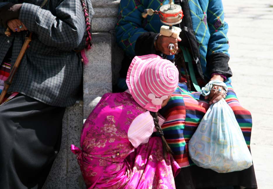 穿著藏袍的小姑娘躲閃著記者的鏡頭,露出帽子上可愛(ài)的小花。她身旁是布達(dá)拉宮外虔誠(chéng)的轉(zhuǎn)經(jīng)者。