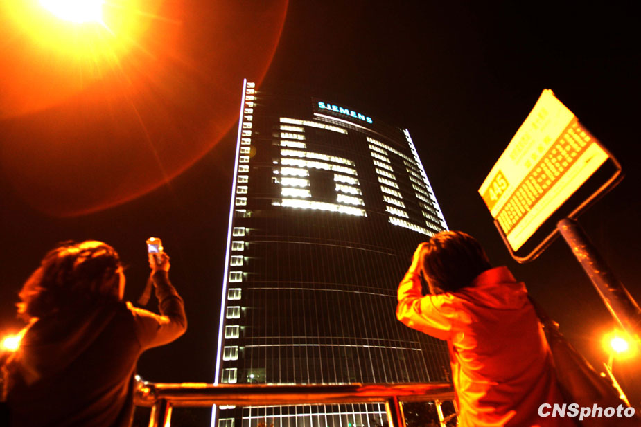 9月28日晚,北京一外企辦公大樓點亮“60”字樣,慶祝新中國成立60周年。中新社發(fā) 張宇 攝