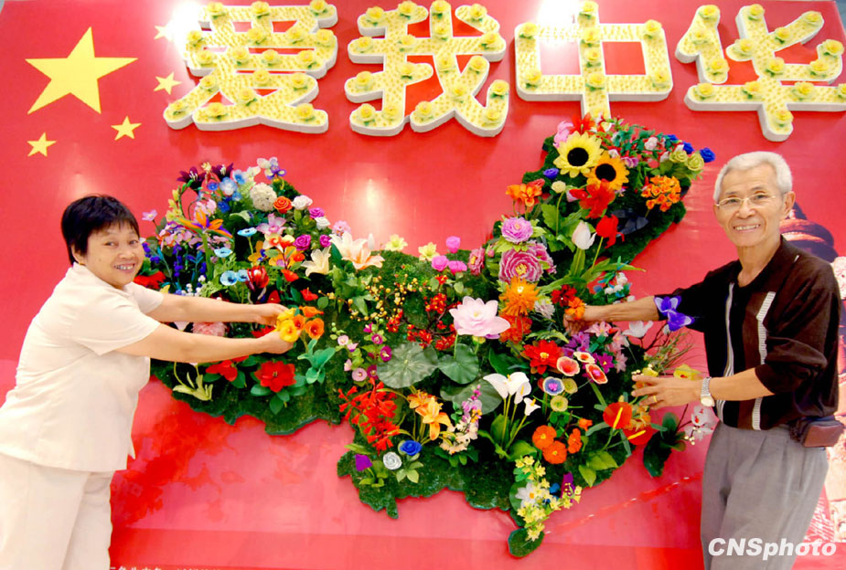 9月28日,浙江省上虞市67歲老人王家驊正在用絲網(wǎng)花拼制中國(guó)地圖。該花卉中國(guó)地圖以紅、黃、綠三色為主色,以鮮艷的五星紅旗為背景,并映顯古老的長(zhǎng)城和華表圖案。地圖上插有56種絲網(wǎng)花,象征56個(gè)民族大團(tuán)結(jié),并選取了各地的代表花為內(nèi)容。地圖上方用5000多粒黃色玻璃沙花芯和60朵黃色牡丹組成“愛(ài)我中華”,寓意中華民族5000年文明和建國(guó)60周年。 中新社發(fā) 韓堅(jiān) 攝