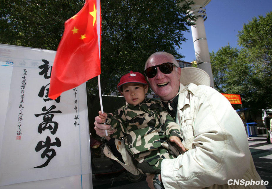 9月27日上午,為迎接國慶60周年,武警西藏總隊(duì)官兵為駐地群眾開展擁政愛民、服務(wù)群眾便民活動。一位外國游客抱著中國孩子,在武警官兵的書法作品“祖國萬歲”前,一起搖動五星紅旗,共慶新中國國慶60周年。 中新社發(fā) 錢檬 攝
