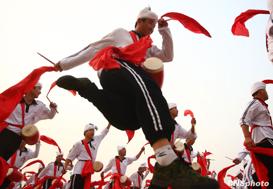 9月16日,千余名來自陜西安塞的腰鼓隊(duì)員在北京密云訓(xùn)練基地和其他方陣合練。該方陣隊(duì)員全部是來自陜西省延安市安塞縣的農(nóng)民,10月1日他們將走在群眾游行隊(duì)伍中,在天安門城樓前舞起安塞腰鼓。該方陣也是群眾游行隊(duì)伍中唯一一支京外隊(duì)伍,唯一一個(gè)全部由農(nóng)民組成的方陣。 中新社發(fā) 杜洋 攝