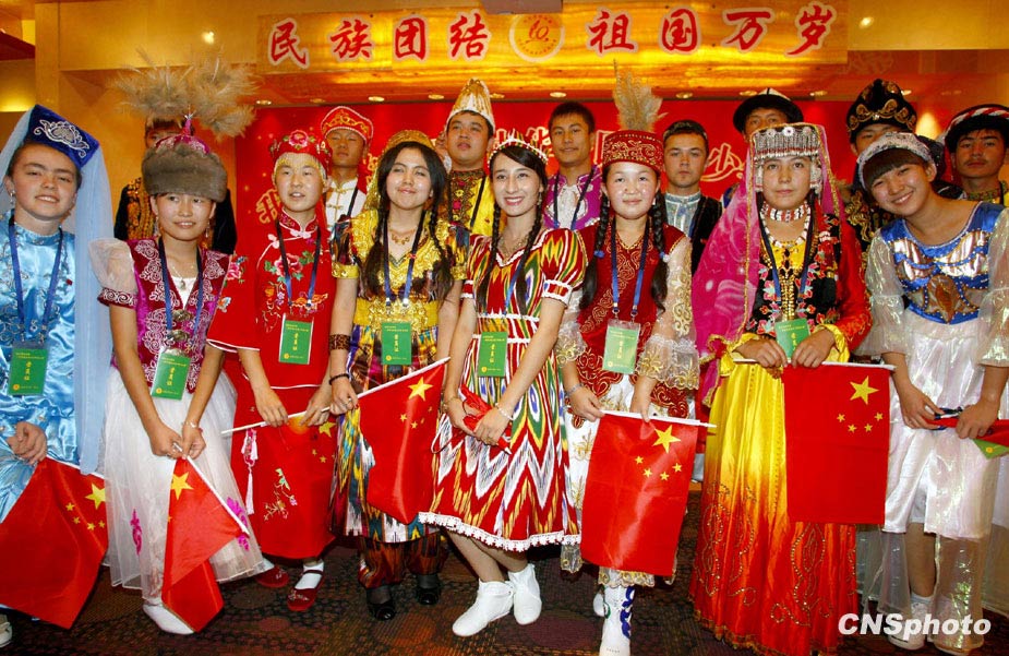 9月24日晚,“我愛我的祖國——中華各民族青少年同心營”在北京開營。本次同心營活動從全國56個民族中挑選男女各一名優(yōu)秀學(xué)生代表共計112人進京參加,在北京期間,營員們不僅將與北京少先隊員一起繡國旗,國慶當天,他們將穿上本民族的服飾,組成“國旗禮儀隊”,簇擁在天安門廣場國旗旗桿下,代表56個民族的青少年共迎國旗。中新社發(fā) 鄭雄增 攝