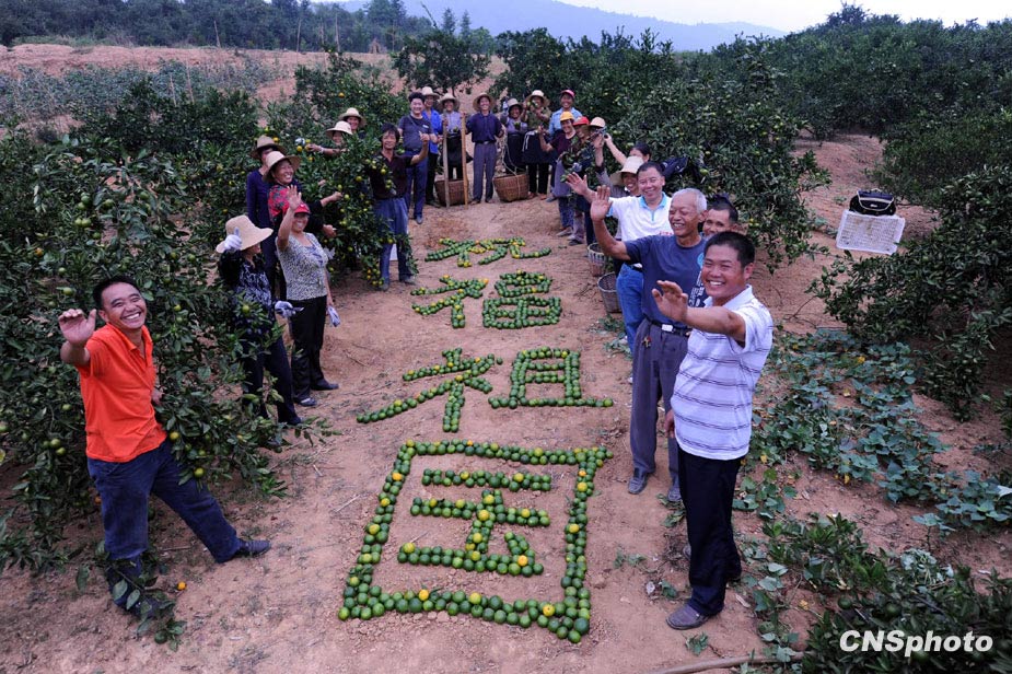 為慶祝新中國成立六十周年,湖南石門縣橘農(nóng)近日用采摘的早熟蜜橘,在橘園擺成“祝福祖國”四個大字,表達對祖國六十華誕的美好祝愿。中新社發(fā) 賀新初 攝
