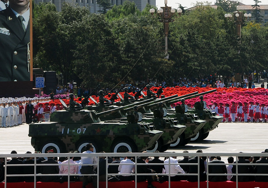 2009年10月1日,中華人民共和國成立60周年慶祝大會在北京天安門廣場舉行。圖為輪式自行迫榴炮方隊。中新網(wǎng)記者 攝