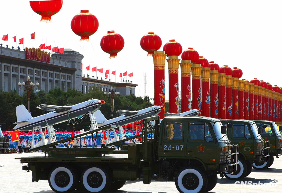 2009年10月1日,中華人民共和國成立60周年慶祝大會(huì)在北京天安門廣場舉行。圖為無人機(jī)方隊(duì)接受檢閱。中新社發(fā) 宋吉河 攝