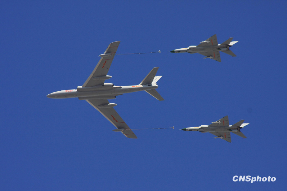 2009年10月1日,中華人民共和國成立60周年慶祝大會在北京天安門廣場舉行。圖為加受油機梯隊通過天安門廣場上空。中新社發(fā) 郭國權(quán) 攝