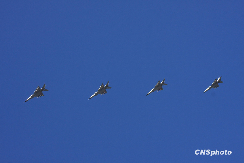 2009年10月1日,中華人民共和國(guó)成立60周年慶祝大會(huì)在北京天安門廣場(chǎng)舉行。圖為殲擊機(jī)梯隊(duì)飛過天安門廣場(chǎng)上空。中新社發(fā) 郭國(guó)權(quán) 攝