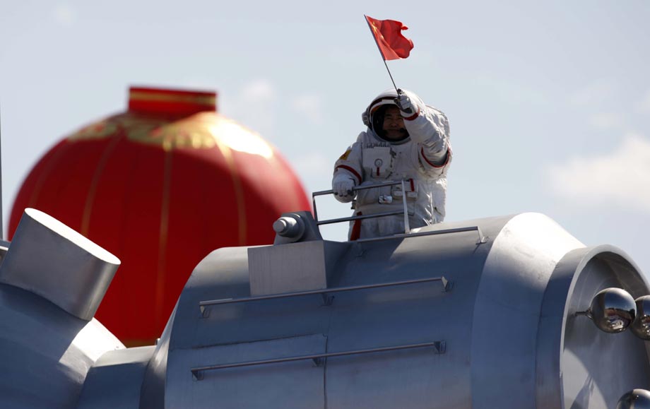 10月1日,中華人民共和國成立60周年慶祝大會在北京舉行,航天員翟志剛等航天人在群眾游行隊伍中亮相。 中新社發(fā) 盛佳鵬 攝