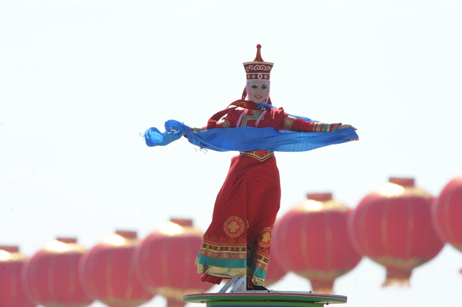 10月1日,首都各界慶祝中華人民共和國(guó)成立60周年大會(huì)在北京舉行。圖為彩車上的演員。中新社發(fā) 廖攀 攝