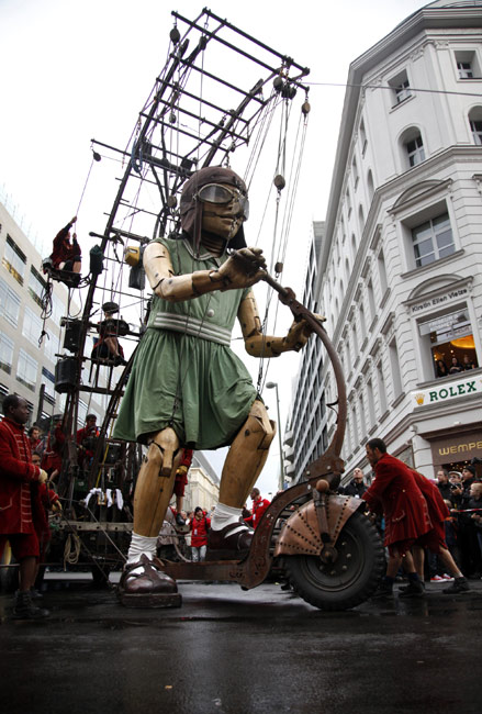 10月2日,來自法國一家戲劇公司的兩個(gè)巨型提線木偶亮相柏林街頭,它們將在露天劇場(chǎng)進(jìn)行表演,以此紀(jì)念柏林墻推倒20周年。圖片來源:中國新聞網(wǎng)