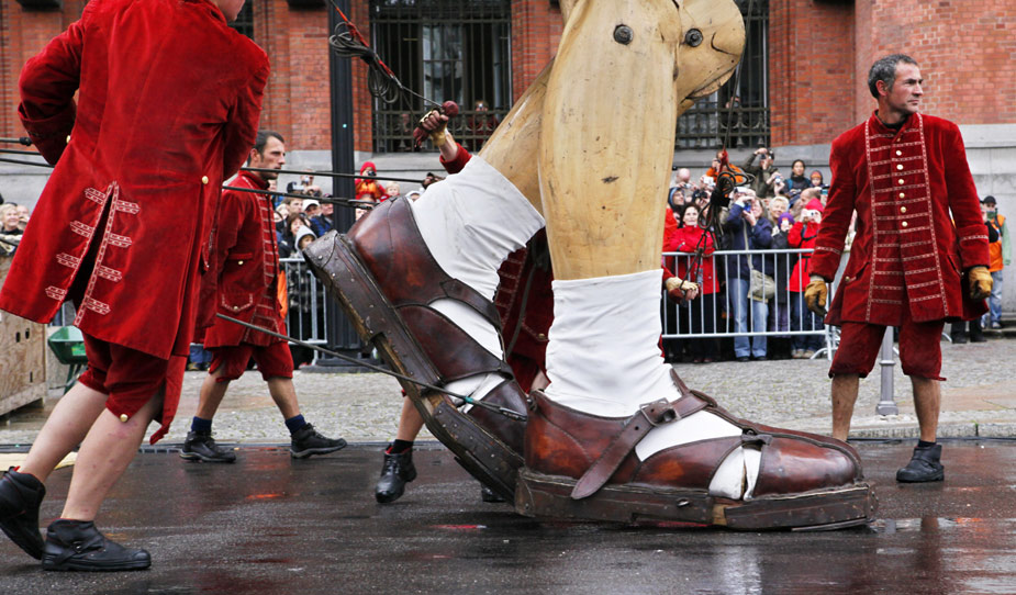 10月2日,來(lái)自法國(guó)一家戲劇公司的兩個(gè)巨型提線木偶亮相柏林街頭,它們將在露天劇場(chǎng)進(jìn)行表演,以此紀(jì)念柏林墻推倒20周年。圖片來(lái)源:中國(guó)新聞網(wǎng)