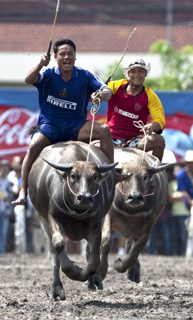 10月3日,泰國(guó)一年一度的騎水牛大賽在春武里舉行。