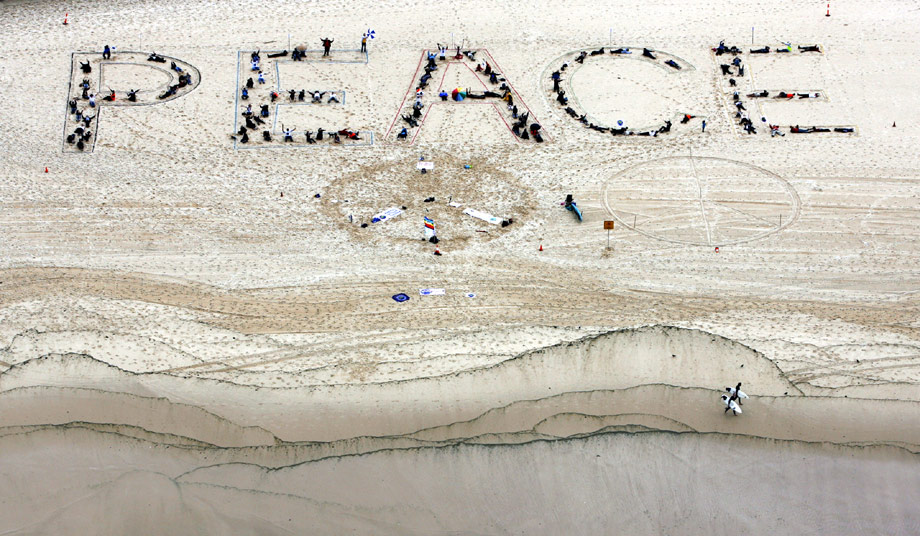 10月4日,一個在全球范圍內(nèi)祈求和平的活動在多個國家展開,呼吁結(jié)束戰(zhàn)爭、消除核武器和結(jié)束各種暴力行為。在澳大利亞悉尼附近的海灘上,參加和平游行的人組成和平圖案。來源:中國新聞網(wǎng)