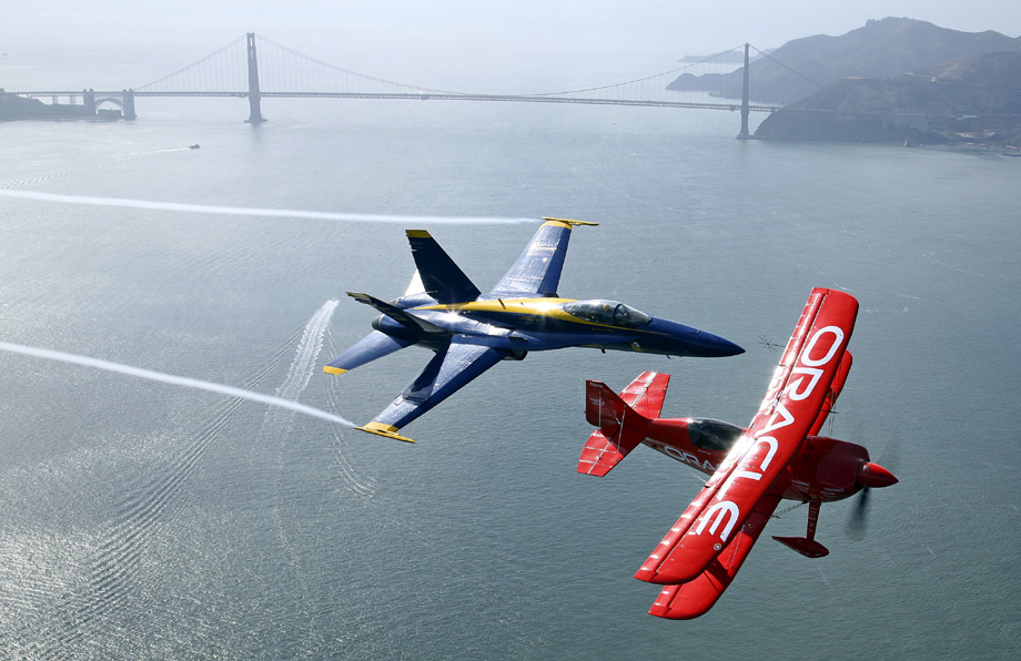 2009年10月8日,美軍飛機在舊金山灣上空進行飛行演練。一年一度的舊金山艦隊周將于10月10日開幕,屆時會有船艦游行和飛行表演等活動。 來源:中國新聞網(wǎng)