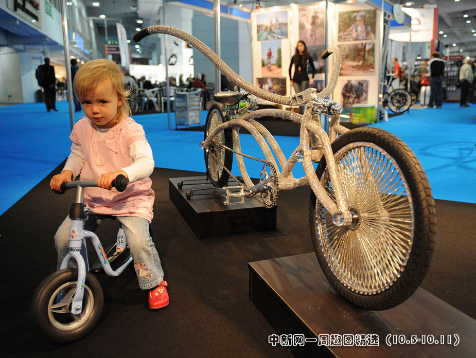 10月8日,2009自行車(chē)展在倫敦市中心開(kāi)幕,超過(guò)11萬(wàn)顆施華洛世奇水晶覆蓋的自行車(chē)成為有史以來(lái)最昂貴的自行車(chē),該車(chē)由英國(guó)人本·威爾遜設(shè)計(jì)制造。來(lái)源:中國(guó)新聞網(wǎng)
