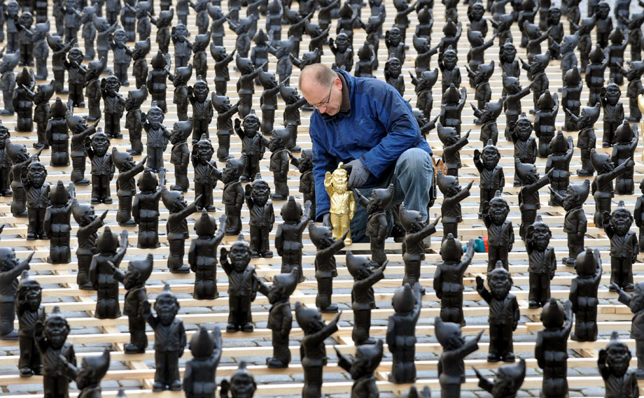 10月14日,德國施特勞賓市街頭擺放了1250個行納粹禮的花園土地神像,“行納粹禮的花園土地神”其實是一款雕塑作品,是由59歲的德國藝術家奧特馬爾·赫勒爾創(chuàng)作的目的在于提醒人們警惕法西斯思想,反對使用法西斯思想控制大眾。