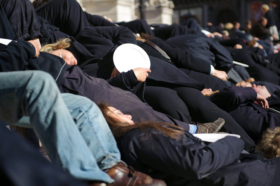 10月15日,示威者身穿黑色衣服、手持空盤子在巴黎歌劇院前抗議。他們此舉是為了呼吁人們關(guān)注世界上的饑民。圖片來(lái)源:中國(guó)新聞網(wǎng)