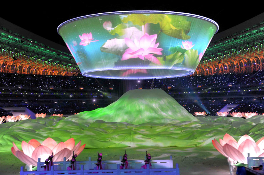 十月十六日晚,中華人民共和國第十一屆運(yùn)動會在山東濟(jì)南奧體中心隆重開幕。圖為文藝晚會上的“巨碗”視頻演繹和平、和諧。中新社發(fā) 陳文 攝