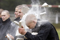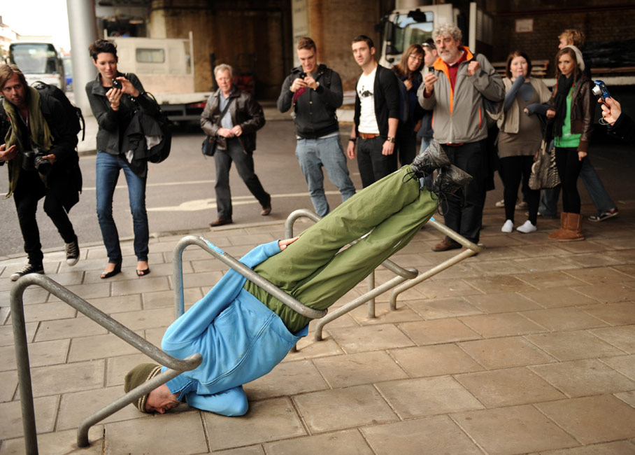 10月16日,來自奧地利的藝術家威利·多勒帶著他的城市空間人體藝術團隊,在倫敦街頭進行藝術表演。幾十位表演者把自己的身體擠進通道入口、壁凹和任何能找得到的公共建筑的縫隙內(nèi),供人們欣賞。