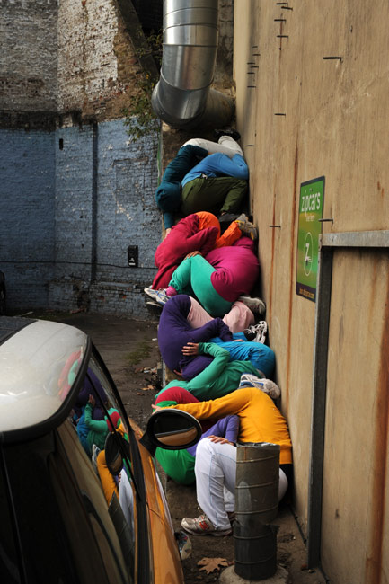 10月16日,來自奧地利的藝術(shù)家威利·多勒帶著他的城市空間人體藝術(shù)團(tuán)隊(duì),在倫敦街頭進(jìn)行藝術(shù)表演。幾十位表演者把自己的身體擠進(jìn)通道入口、壁凹和任何能找得到的公共建筑的縫隙內(nèi),供人們欣賞。
