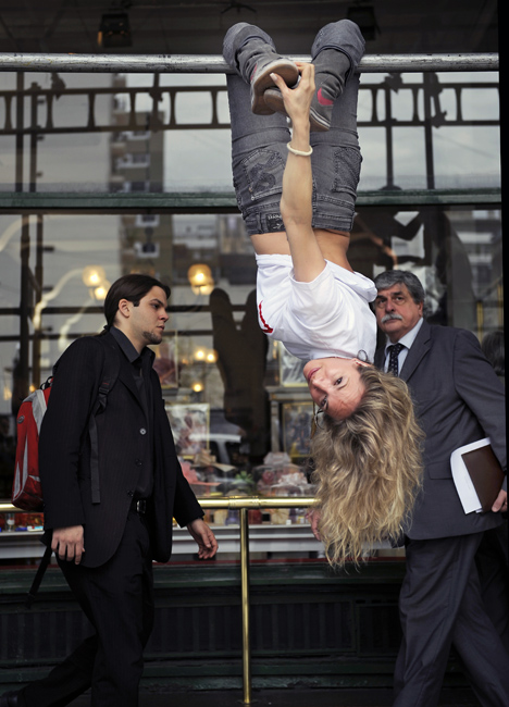 10月19日,阿根廷布宜諾斯艾利斯市街頭,鋼管舞小姐在街頭表演,路邊的路燈、電線桿變身為鋼管舞道具。圖片來源:中國新聞網(wǎng)