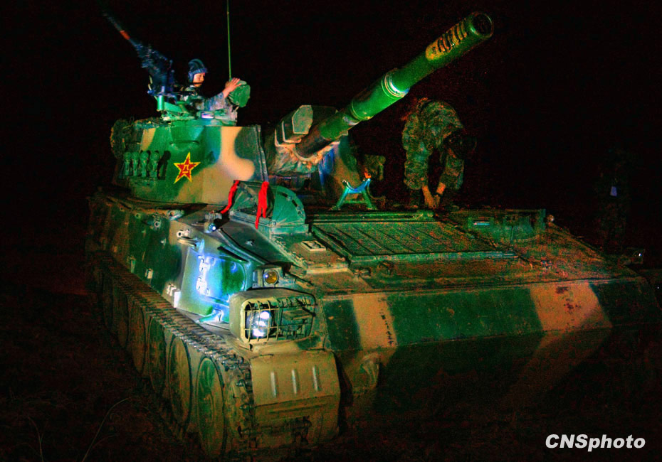 當(dāng)晚國防大學(xué)防務(wù)學(xué)院、空軍指揮學(xué)院的外軍學(xué)員,以及英國、以色列、土耳其、巴基斯坦等國軍事觀察員親臨現(xiàn)場觀摩了后勤保障戰(zhàn)斗準(zhǔn)備、自行榴彈炮占領(lǐng)陣地、裝甲車輛“摸黑”開進(jìn)等戰(zhàn)斗要素。圖為“摸黑”進(jìn)入陣地的主戰(zhàn)坦克。中新社發(fā) 宋吉河 攝