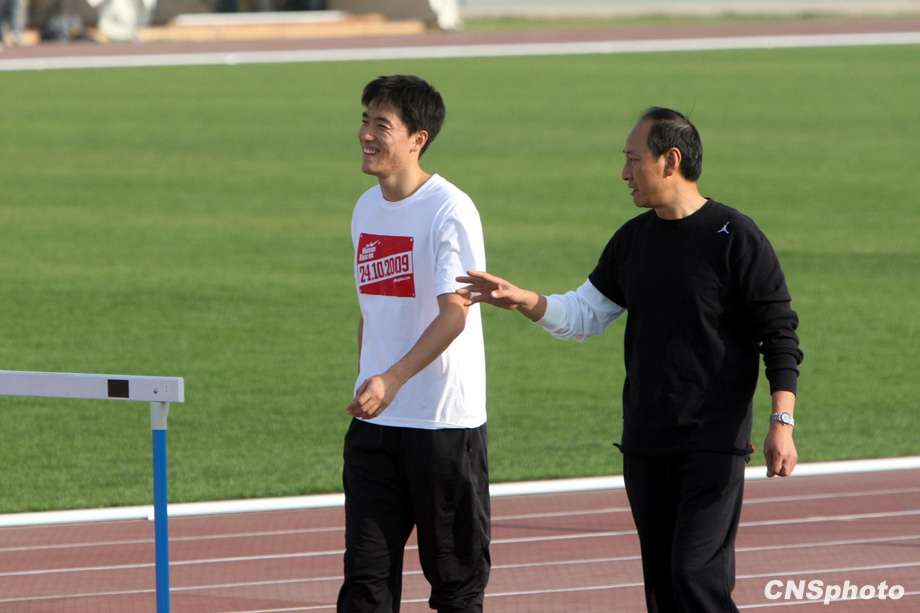 10月22日下午,“飛人”劉翔亮相濟南奧體中心田徑訓練場,在教練孫海平的帶領下,輕松備戰(zhàn)全運會。中新社發(fā) 湯彥俊 攝