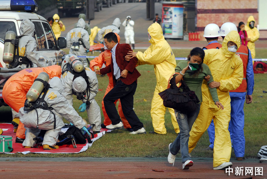 緊隨其后進場的是防化醫(yī)學救援隊。該分隊指揮員帶領(lǐng)后續(xù)偵察分隊、洗消分隊和化驗組,分別乘坐4輛防化偵察車、1輛淋浴車和1輛防化化驗車入場。穿藍色和橙色防護服的防化醫(yī)學救援隊入場后,醫(yī)療衛(wèi)生人員迅速展開裝備,組織檢驗監(jiān)測,開設(shè)臨時醫(yī)療所,區(qū)分觀察區(qū)、檢診區(qū)、洗消區(qū)和處置區(qū),救護車開始中毒人員轉(zhuǎn)運。 郝飛 攝