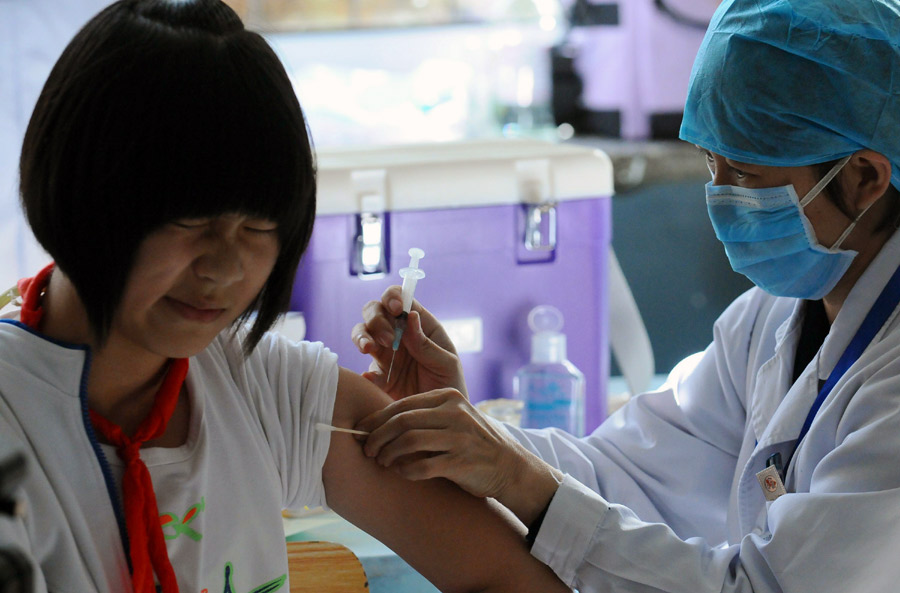 周三(21日),北京市朝陽區(qū)垂楊柳中學初一(2)班的學生正在接種甲型H1N1流感疫苗。從當天起至12月31日期間,北京市的中小學生、老人等五類重點人群,在知情自愿的原則下,將免費接種甲流疫苗。中新社發(fā) 侯宇 攝