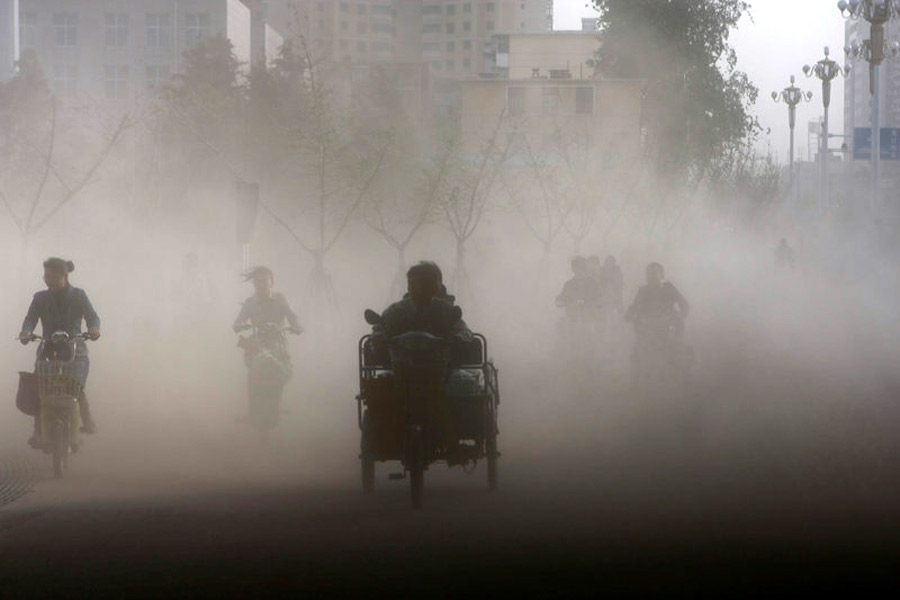 周日(18日), 河北石家莊,中華大街與裕華路交口,自行車在大風(fēng)引起的揚(yáng)塵中艱難前行。10月18日起,北方迎來(lái)大幅降溫,部分地區(qū)風(fēng)力將達(dá)8級(jí)。 阿拉爾 攝