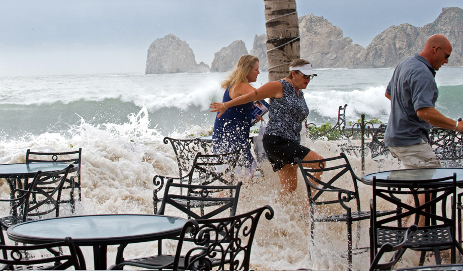 當?shù)貢r間10月19日,墨西哥圣盧卡斯角,颶風里克已經(jīng)在墨西哥沿海升級為10年來威力最強的颶風。圖為游客被海邊的巨浪趕跑。
