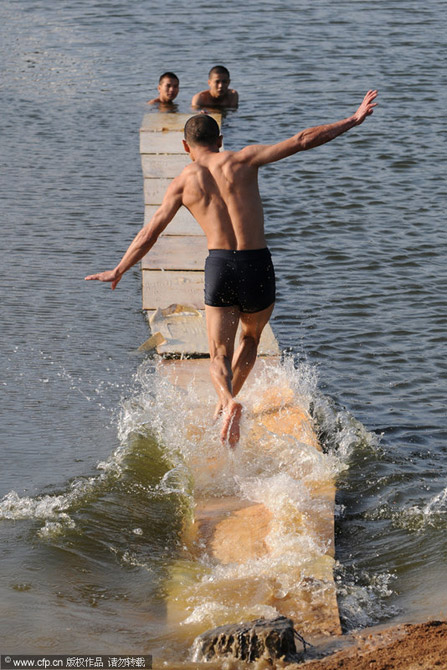 10月22日上午7時(shí)許,釋理亮和他的徒弟用塑料尼龍繩將12塊長(zhǎng)1.2米、寬60厘米、厚約0.6厘米的輕薄三合板連在一起,在助跑10多米后,如離弦之箭,蜻蜓點(diǎn)水般地跑過三合板,以極快的速度在水面上“飛”了15米遠(yuǎn),整個(gè)過程不到5秒鐘。 林朝陽/CFP