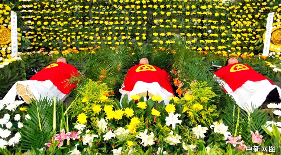 陳及時、何東旭、方招三 位英雄的遺體安放在鮮花叢中。曾尉 攝