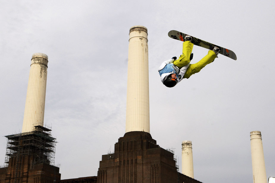 周五(30日),英國一位滑雪板高手在倫敦的一個(gè)電站前參加世界杯滑雪板比賽。 來源:中國新聞網(wǎng)