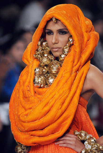 11月5日,巴基斯坦第一屆時(shí)裝周在卡拉奇拉開帷幕。美女模特們身著裸露雙肩和肚臍的非伊斯蘭傳統(tǒng)服裝在T臺(tái)上走秀。