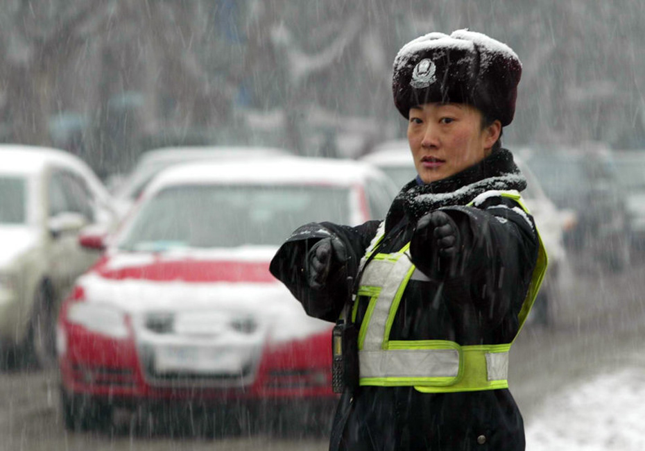 11月12日,在濟南市經(jīng)七緯二路口,濟南市公安局交警支隊市中大隊女子中隊民警黃雷冒雪疏導(dǎo)交通。袁鵬 攝